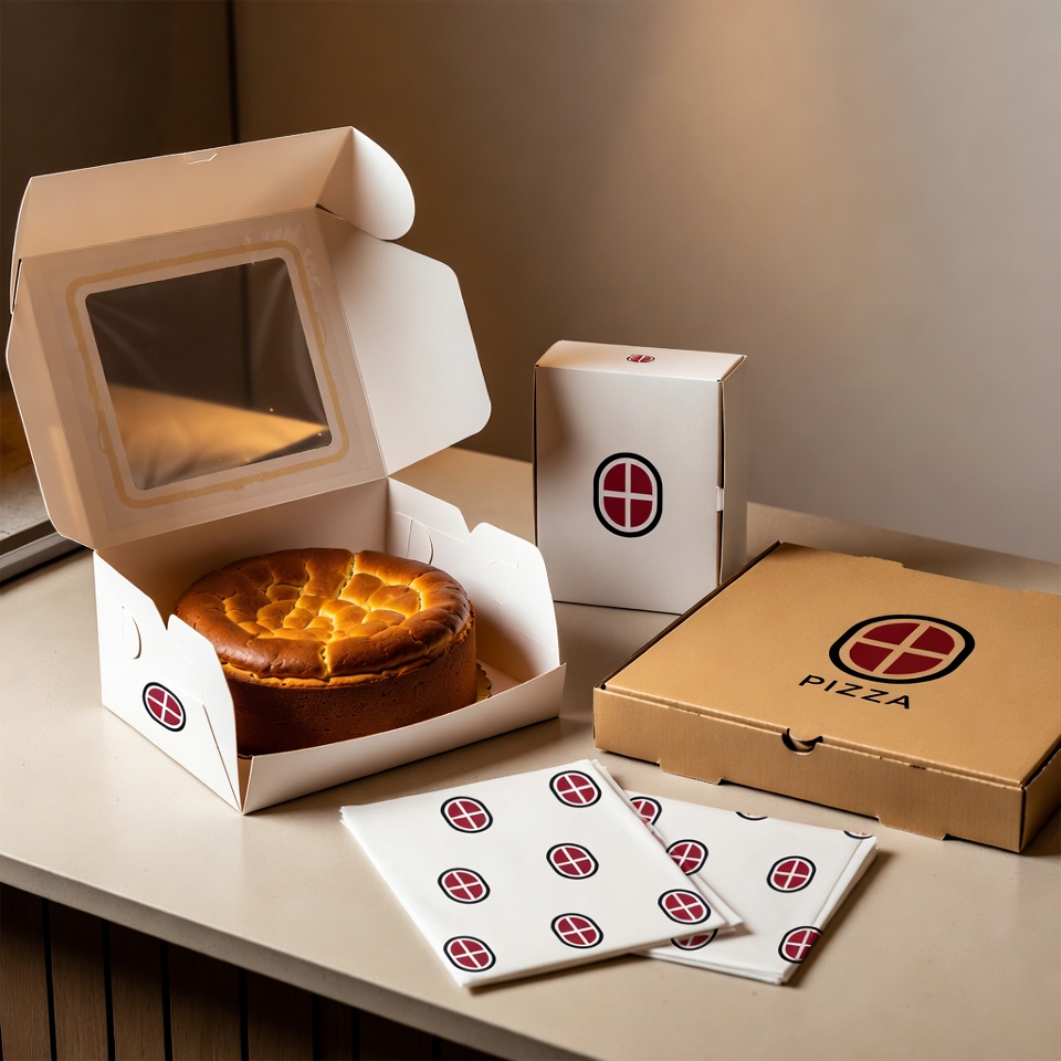 Custom cake boxes, pizza boxes, greaseproof sheets, snack boxes, coffee boxes and more. All food-safe, fully printed, compliant with UK food packaging standards.